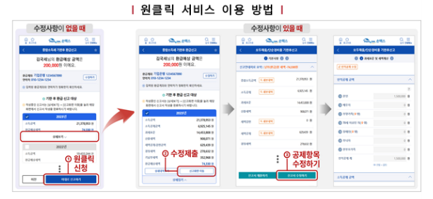 또한 국세청 원클릭 환급서비스에서는 기존 환급금액을 수정 없이 그대로 신고하면 환급금이 1개월 이내 지급되며, 수정을 하더라도 2~3개월 내 빠르게 입금됩니다. 수정 신고 시에도 홈택스 시스템이 자동으로 세액을 재계산하여 국세청 원클릭 환급서비스 이용자는 복잡한 계산을 직접 하지 않아도 됩니다.