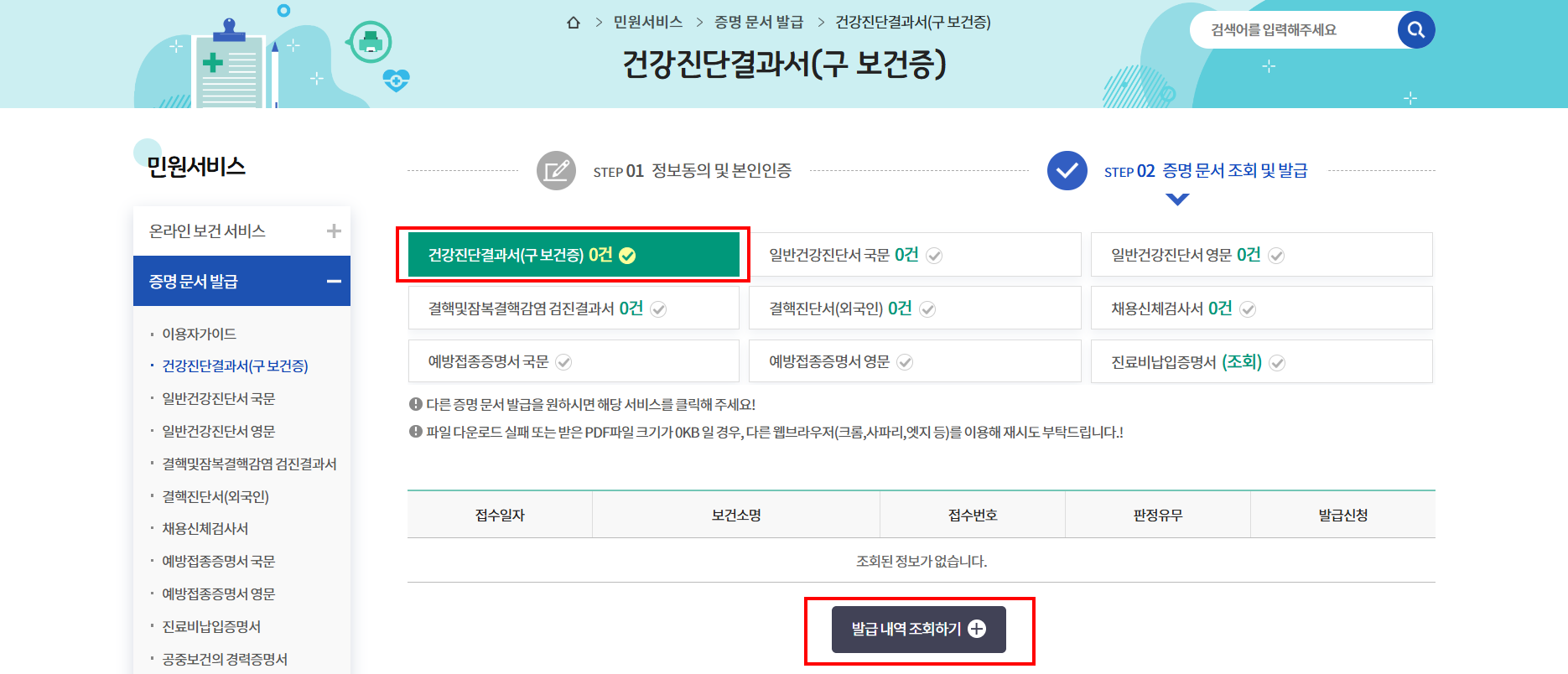 - 인증 완료 후 건강진단결과서(구 보건증) 항목 선택 > 발급 내역 조회하기 클릭