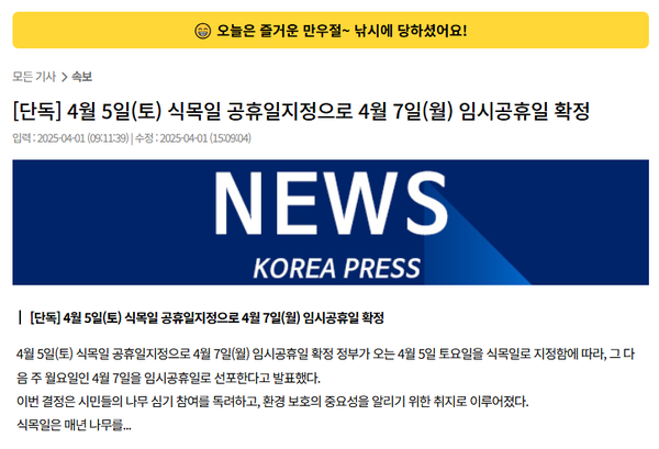 결론부터 말하면, 이 뉴스는 만우절 공휴일 가짜뉴스였습니다.