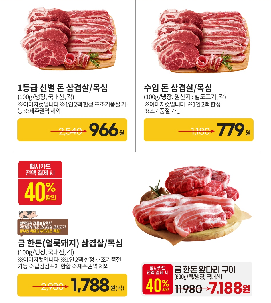| 금 한돈(얼룩돼지) 삼겹살/목심 (100g, 냉장, 국내산) | 1,788원 | 행사카드 전액 결제 시 40% 할인 |